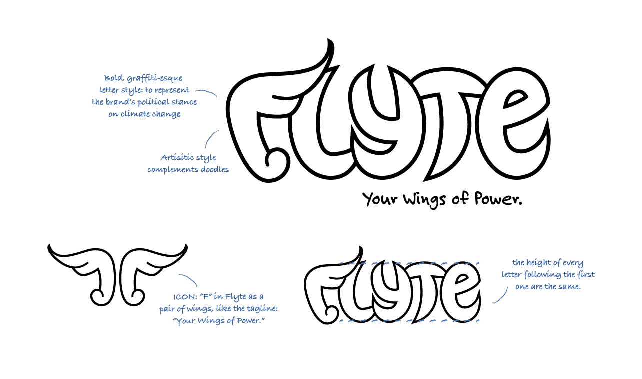 The Flyte logo embodies movement and freedom. Because of this, we created a custom typeface, where the ‘F’ takes on a wing-like form as a symbol of momentum. Paired with our tagline, “Your Wings of Power,” Flyte’s uplifting energy is etched into every detail, giving consumers the confidence to move, create, and take flight.