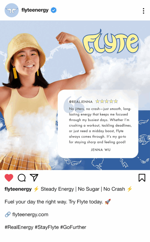 Through product introductions, lifestyle imagery, and customer spotlights, Flyte’s social feed embodies confidence and positivity. The visuals and captions work together to celebrate wellness, ambition, and empowerment, encouraging followers to live boldly and stay refreshed.