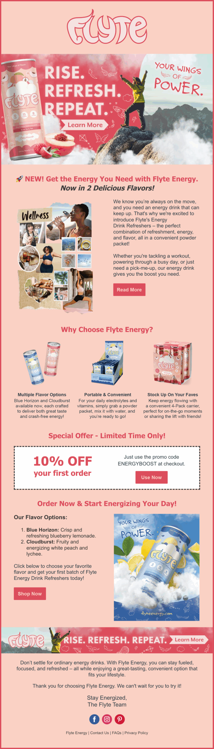 Flyte’s email campaigns were designed to stand out in the inbox while staying true to the brand identity. Each message highlights product launches and special offers in a consistent, digestible format. As the brand evolves, Flyte’s emails will go beyond promotions, featuring wellness tips, community updates, and positive messaging that inspire better energy.