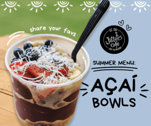 The Açaí Bowl Facebook post highlights a refreshing summer menu item, most popular among young children, teenagers, college students, and millennials. The post itself includes branded visuals such as the Jitters logo, while the caption prompts viewers to comment with their favorite bowl toppings. This not only builds awareness for the seasonal offering, but it also opens the door for casual community-driven conversation around their menu.