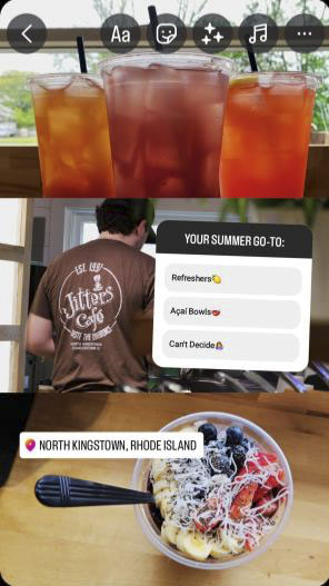 Stories are meant to be quick, and users often swipe through them without much pause, so our goal was to combine simple yet engaging visuals with bids for user engagement. One story includes a poll asking followers to choose between two popular summer items: açaí bowls and refreshers. Beyond quick votes and engagement, the poll also offers Jitters insight into customer preferences, which could help guide future product promotion. There is also a location tag on the story so viewers know exactly where to get these delicious options.