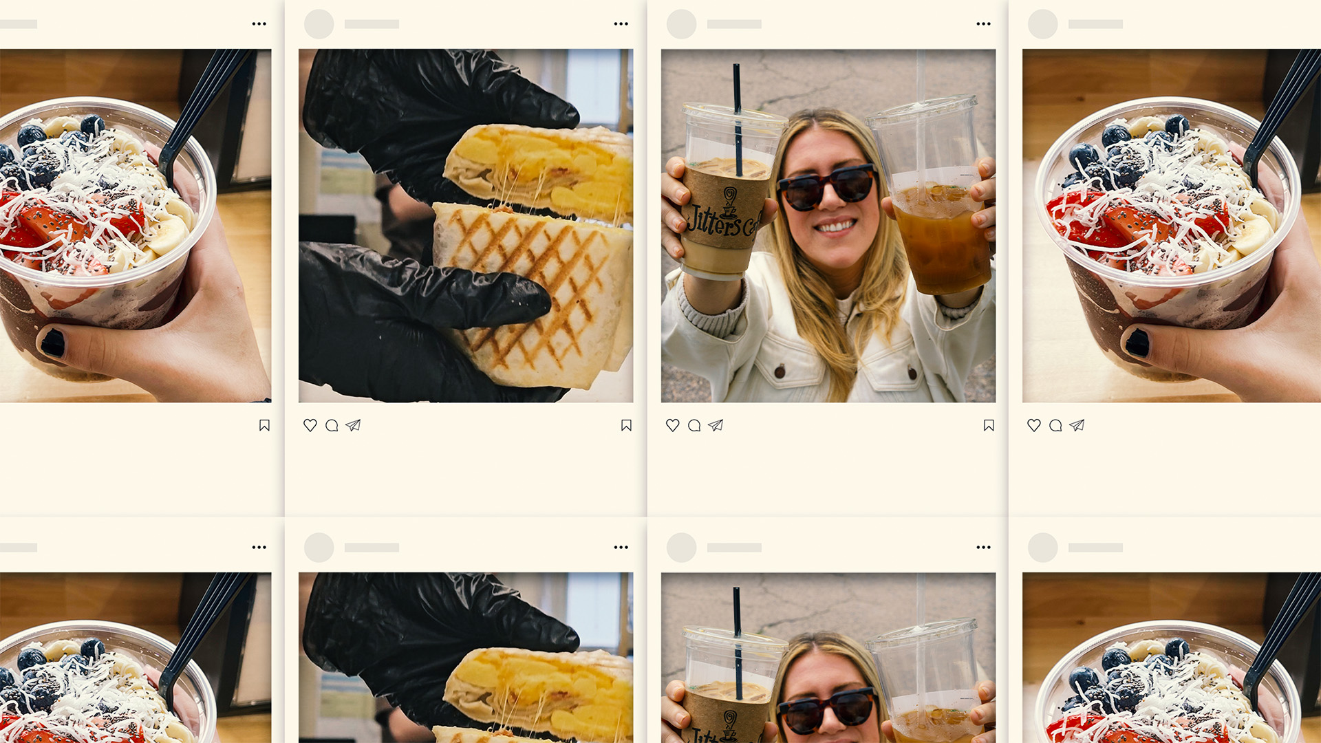 Stories are meant to be quick, and users often swipe through them without much pause, so our goal was to combine simple yet engaging visuals with bids for user engagement. One story includes a poll asking followers to choose between two popular summer items: açaí bowls and refreshers. Beyond quick votes and engagement, the poll also offers Jitters insight into customer preferences, which could help guide future product promotion. There is also a location tag on the story so viewers know exactly where to get these delicious options.